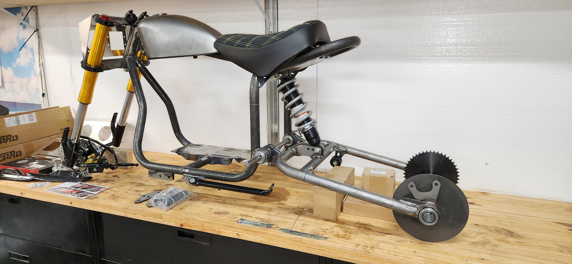- Custom Fabricated Triple clamps (a little wider to fit a 10" wide front tire if you want)