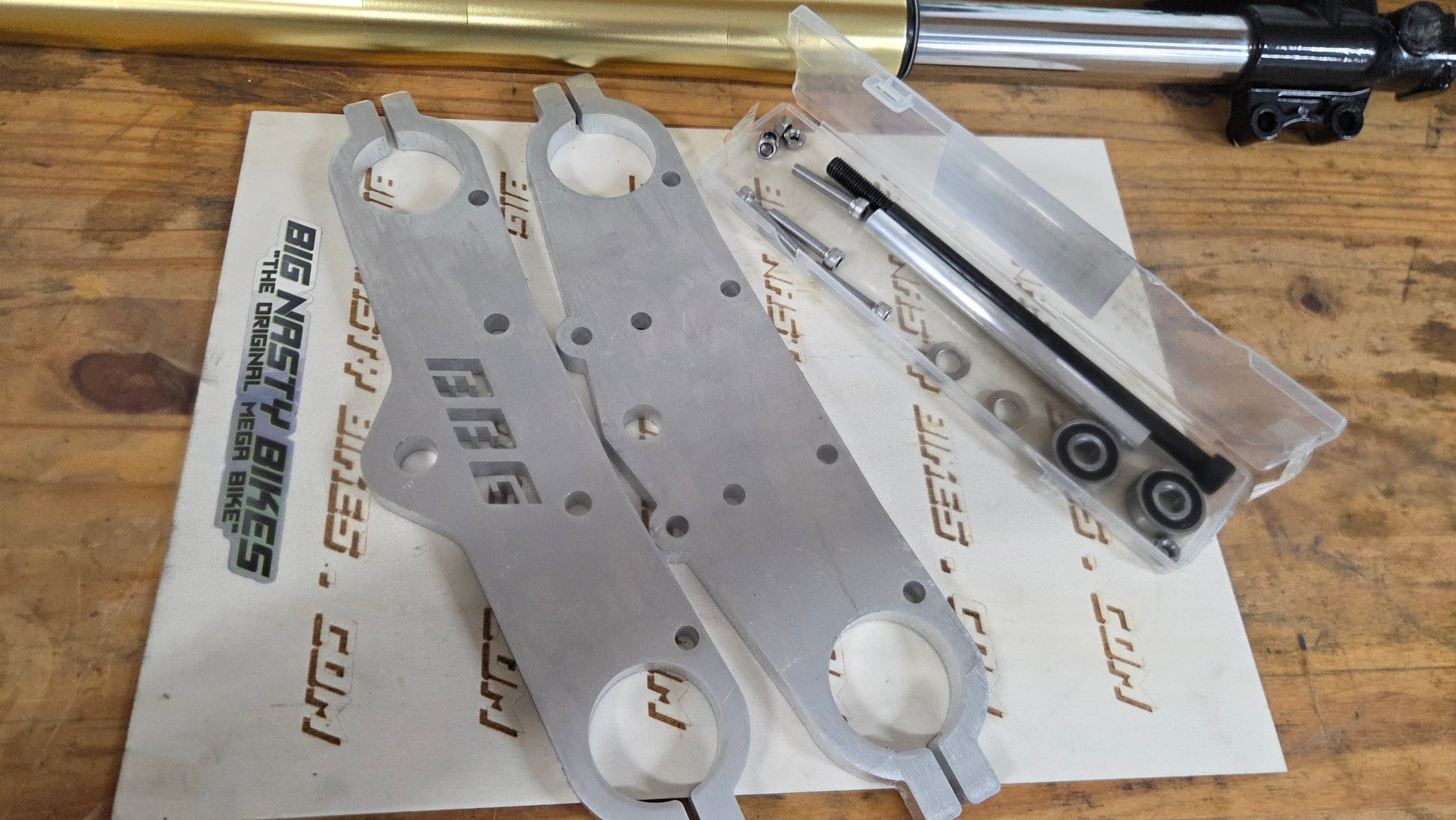 Custom 6061 Aluminum Triple clamps with handlebar mounts located 2" further forward for a more comfortable ride.